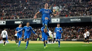 En el 74’, Cömert evitó el mano a mano de Mbappé rebañándole el balón en última instancia. El francés pudo ampliar la ventaja minutos más tarde, pero su tiro cruzado se marchó cerca del poste izquierdo valencianista. Ya en el añadido, Mbappé no falló al aprovechar una buena asistencia de Brahim, que previamente había recibido un pase largo de Huijsen. El delantero anotó su 23º gol en esta Liga con un remate con la derecha y el Madrid se llevó los tres puntos de Mestalla.